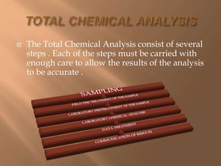 This document discusses various types of errors that can occur in chemical analysis and sampling. It describes determinate errors, which can be identified and corrected, and include constant and proportional determinate errors. It also discusses indeterminate errors, which occur randomly. The document provides definitions and formulas for key statistical concepts used to evaluate precision and accuracy in chemical analysis, including mean, median, standard deviation, variance, control charts, and confidence limits.