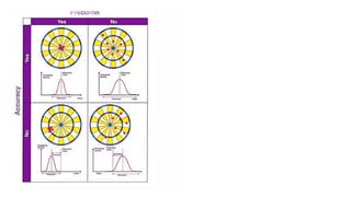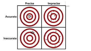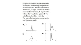 The document discusses the concepts of errors and accuracy in measurements, outlining two main types of errors: random and systematic. Random errors arise from the experimenter and can often be mitigated, while systematic errors are inherent to the measuring equipment. It also distinguishes between accuracy, which refers to how close a measurement is to the true value, and precision, which measures the consistency of measurements, emphasizing that accuracy is dependent on the experimenter and precision on the instrument.