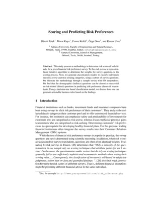 This document presents a methodology for predicting individuals' risk preferences using a regression-based iterative algorithm that weighs survey questions and classifies respondents into risk-averse and risk-seeking categories. The method is demonstrated through a survey of 656 participants, showing that indirect demographic questions can effectively classify risk preferences. The findings aim to improve financial service customization by providing actionable business rules for financial institutions based on the classifications generated.