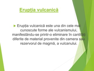 Erupțiile vulcanice sunt cauzate de flotabilitatea și presiunea gazelor din scoarța terestră care determină eliberarea magmei. Acestea pot avea efecte devastatoare, inclusiv răcirea globală, distrugerea recoltelor și amenințarea vieților oamenilor din jurul vulcanului. Este esențial să identificăm vulcanii periculoși, precum Vezuv, care amenință 600.000 de oameni și necesită un plan de evacuare bine structurat.