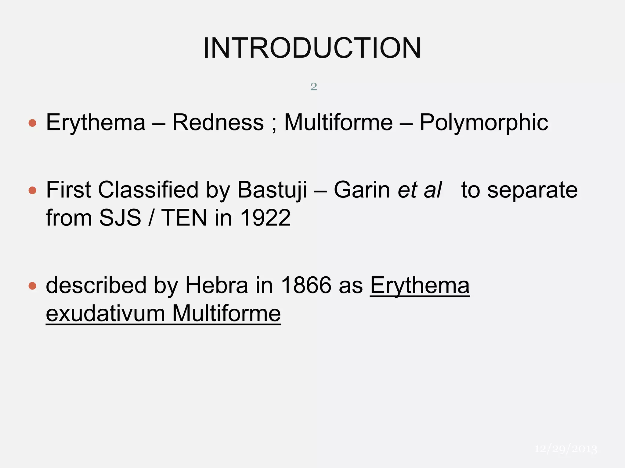 Erythema multiforme is an acute, recurrent skin condition characterized by target-shaped lesions that commonly appear on the extremities and face. It is caused by herpes simplex virus or Mycoplasma pneumoniae infections triggering an immune response in genetically predisposed individuals. The condition ranges from isolated skin involvement to more severe cases affecting the mucous membranes. Treatment focuses on managing underlying infections, reducing symptoms with corticosteroids, and preventing recurrences with antivirals.