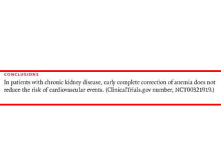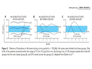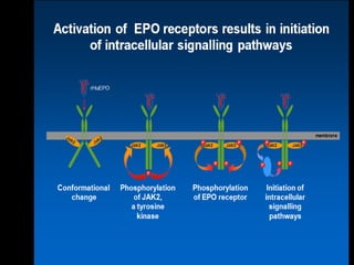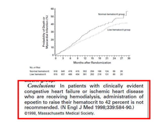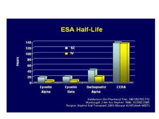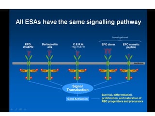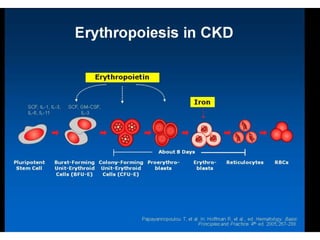 The document discusses the biology and clinical use of erythropoietin (EPO), emphasizing its production in kidneys, management strategies for anemia in chronic kidney disease (CKD), and major clinical trial findings. It highlights the importance of EPO in improving patient outcomes in CKD and the need for careful monitoring and dosing to avoid complications. Additionally, it addresses cautionary notes regarding EPO use in specific patient populations and the advantages of long-acting EPO formulations like darbopoietin.