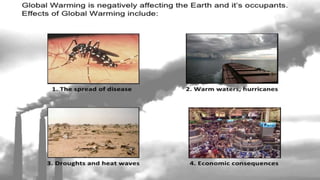The document discusses global environmental issues, focusing on climate change, global warming, acid rain, and ozone layer depletion. It outlines their causes, including human activities like fossil fuel burning and deforestation, and natural processes, while detailing the adverse effects such as rising sea levels, extreme weather conditions, and ecosystem damage. The document also suggests remedies to mitigate these issues, emphasizing the importance of reducing, reusing, and recycling, as well as adopting eco-friendly practices.