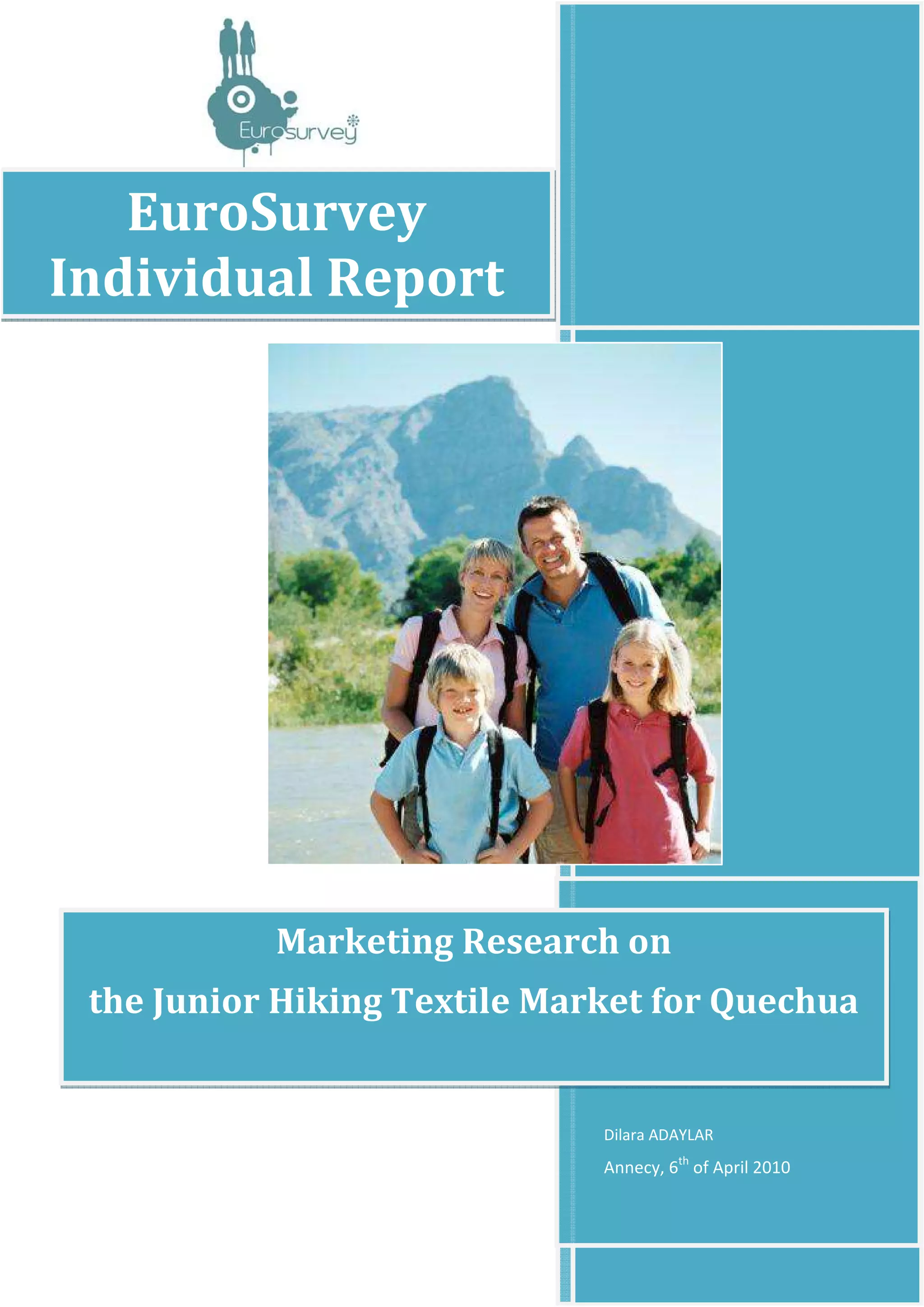 This document provides an analysis of a marketing research survey conducted on the junior hiking textile market for Quechua across several European countries.