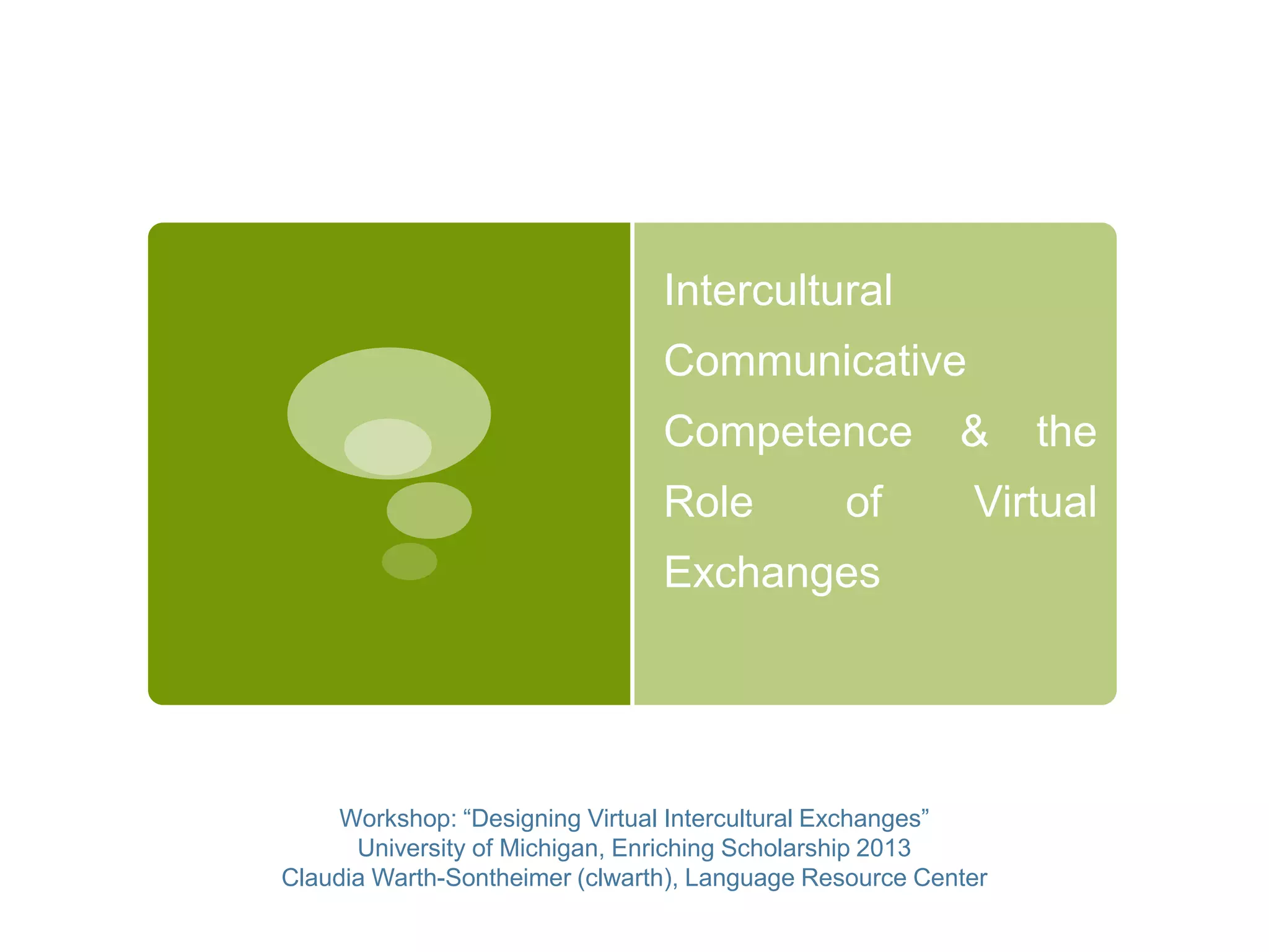 Virtual exchanges can develop intercultural communicative competence (ICC) by providing authentic intercultural interaction using a foreign language in a controlled online environment. ICC involves intercultural competence, cultural competence, and communicative competence, including understanding cultural concepts/artifacts of one's own and other cultures. Byram's model of ICC includes attitudes of openness, knowledge of social groups and cultures, skills in interpreting/relating other cultures and discovering/interacting in intercultural situations, and critical cultural awareness. Learning contents can explore "languaculture," the connection between language and culture, and "rich points" when cultural assumptions differ.