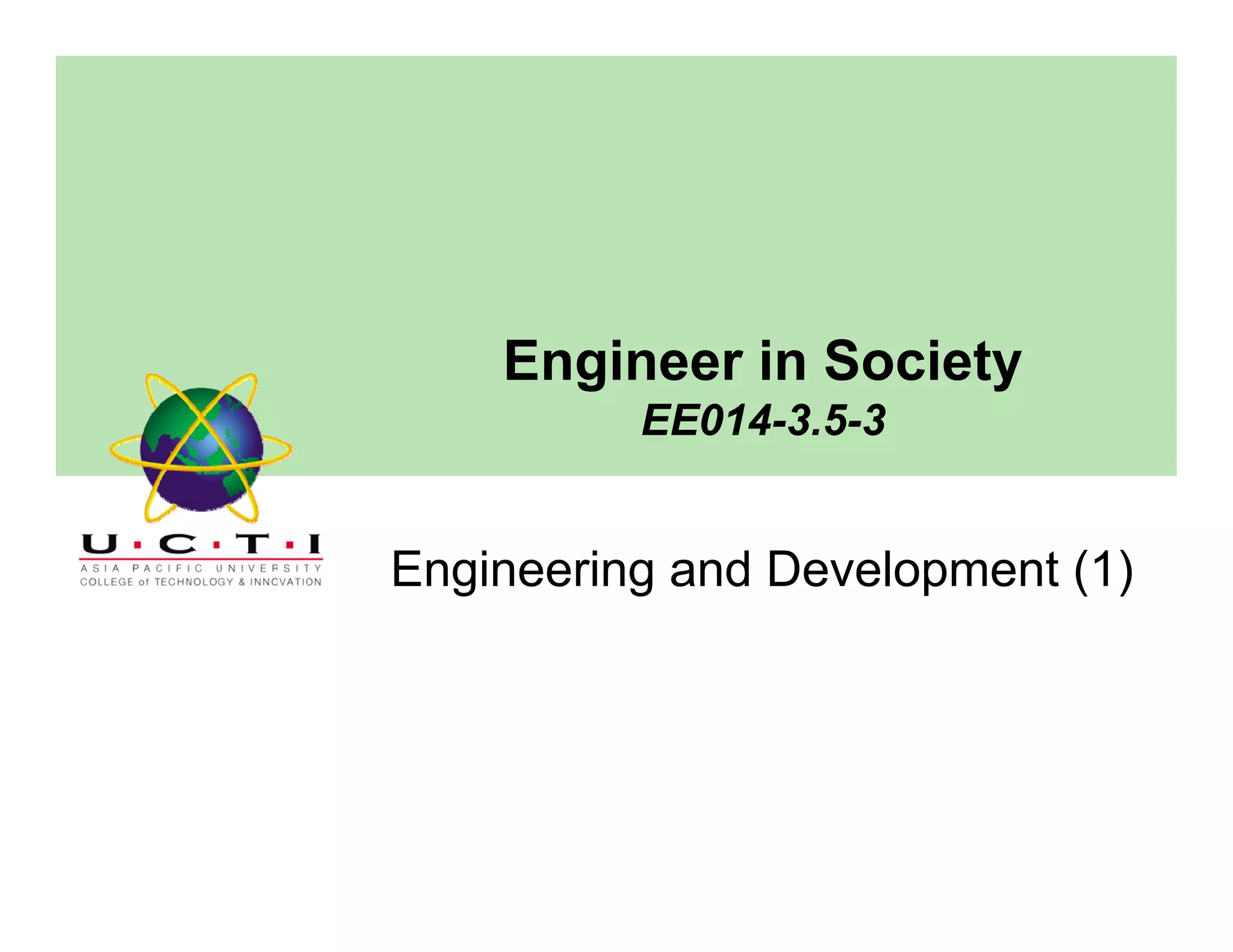 Engineers play a crucial role in a country's development by designing infrastructure and producing goods and services to raise the economy and standard of living. Development involves transforming traditional societies into modern, high-productivity nations with manufacturing and service industries. The objectives of development are to improve sustenance, increase self-esteem and freedom of choice by widening access to life's necessities. Countries are assessed based on economic indicators like GNP and GDP, social indicators like education and health, and science/technology levels. Engineers contribute to development by building infrastructure and industries in developing countries.