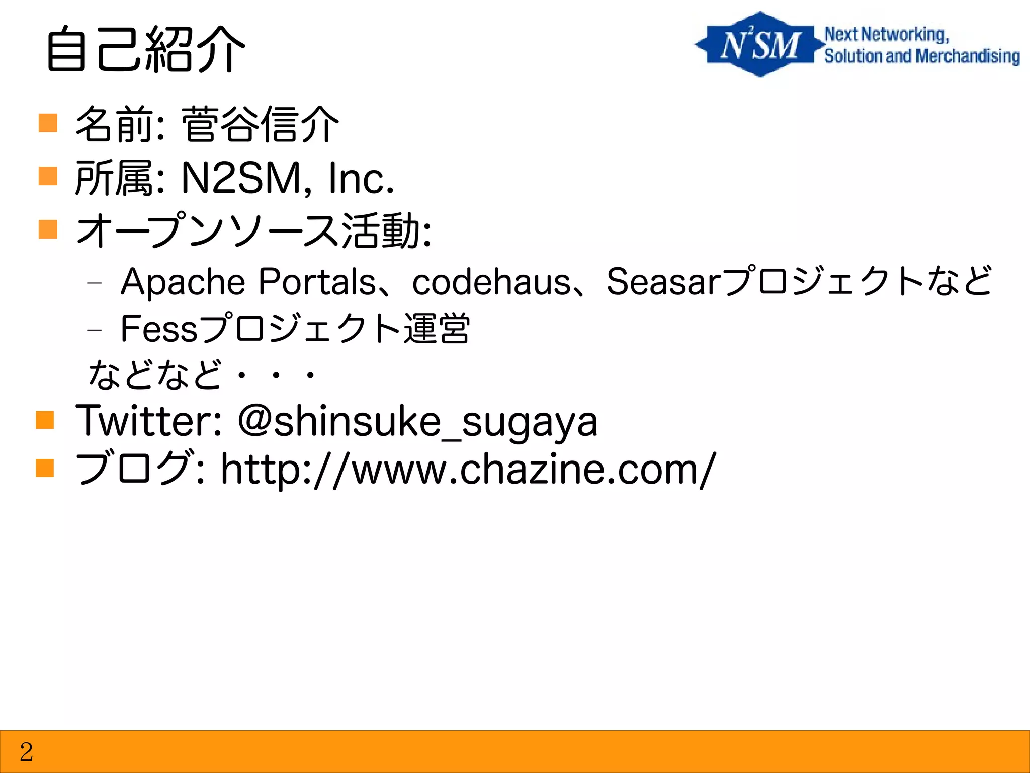 所属: N2SM, Inc. オープンソース活動: – Apache Portals、codehaus、Seasarプロジェクトなど – Fessプロジェクト運営 などなど・・・ Twitter: @shinsuke_sugaya ブログ: http://www.chazine.com/ 自己紹介 2
