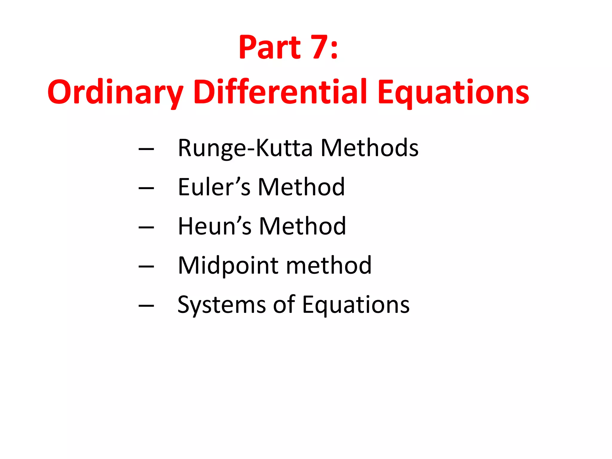 This document summarizes numerical methods for solving ordinary differential equations (ODEs), including Runge-Kutta methods like Euler's method, Heun's method, and the midpoint method. It also discusses solving systems of ODEs using Euler's method by applying it separately to each equation at each time step. The document provides examples applying these methods to solve sample ODEs and systems of ODEs.