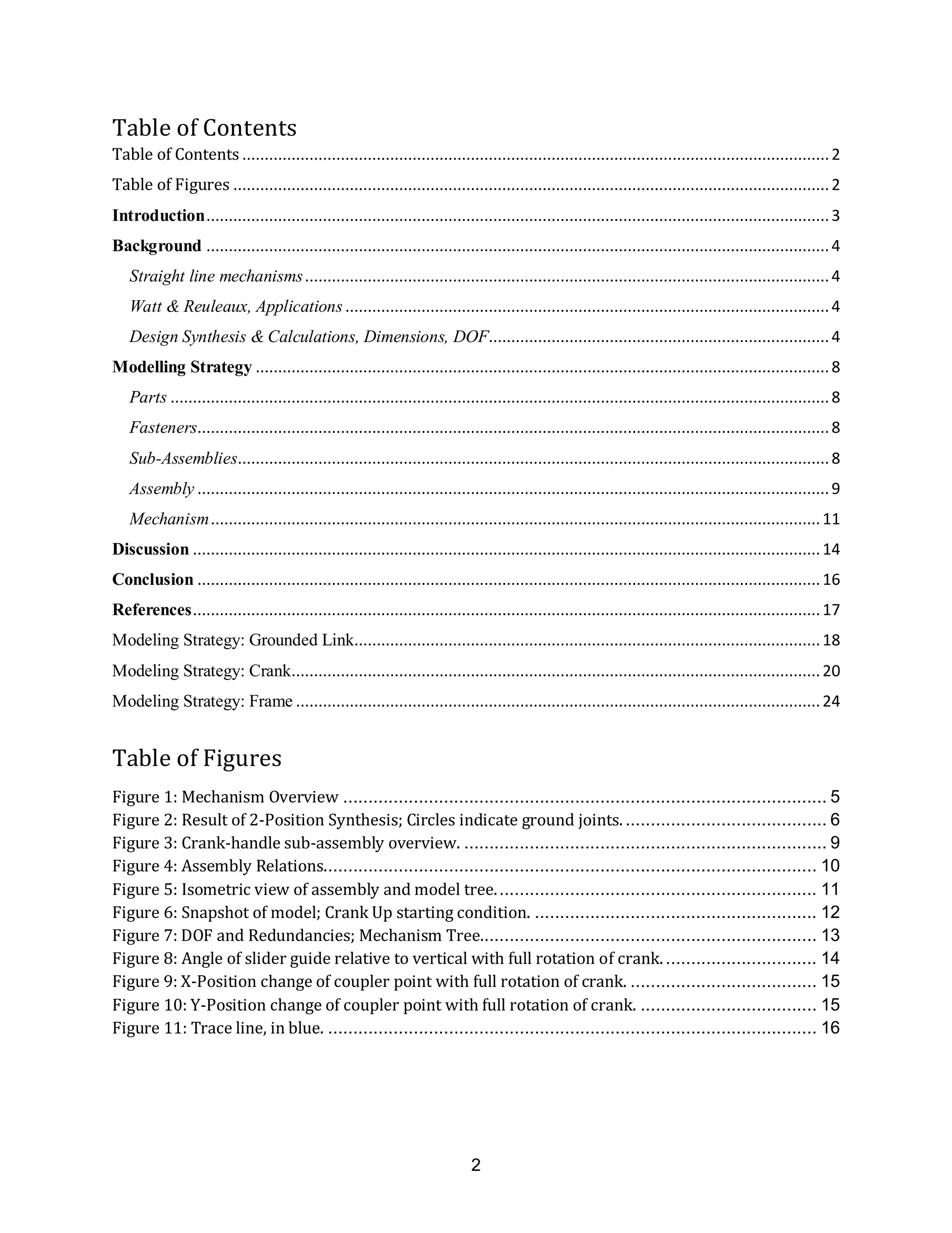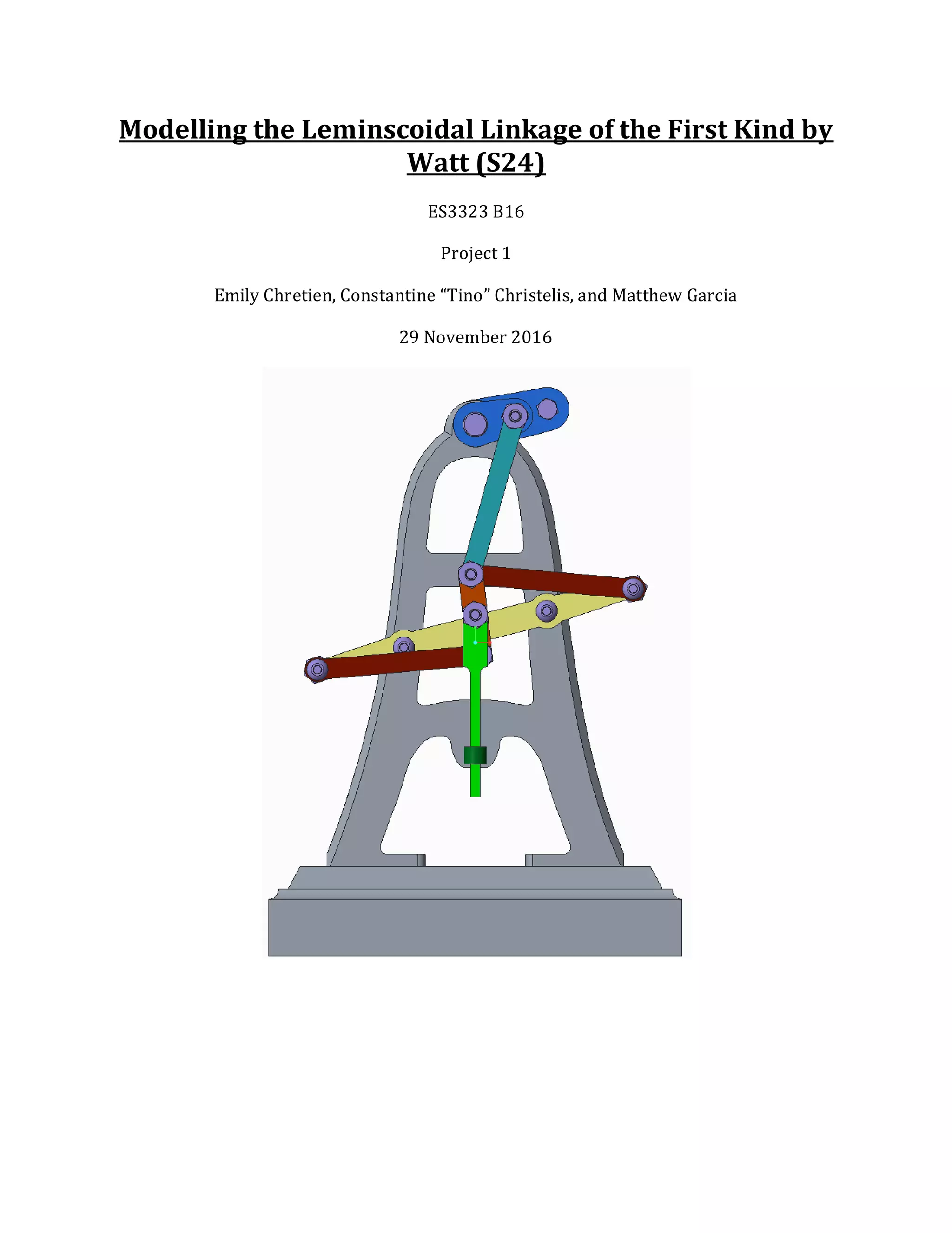 This document describes the modeling of a Watt's straight-line linkage mechanism in Creo Parametric software. It provides background on straight-line mechanisms and the specific Watt linkage. Design calculations are shown to verify the mechanism has one degree of freedom. The modeling strategy involved creating individual parts, subassemblies, and applying constraints. Kinematic analysis of the full assembly found low deviations from straight-line motion of less than 0.0013 inches per vertical inch of the slider. The model accurately represented the intended straight-line motion of the Watt linkage mechanism.