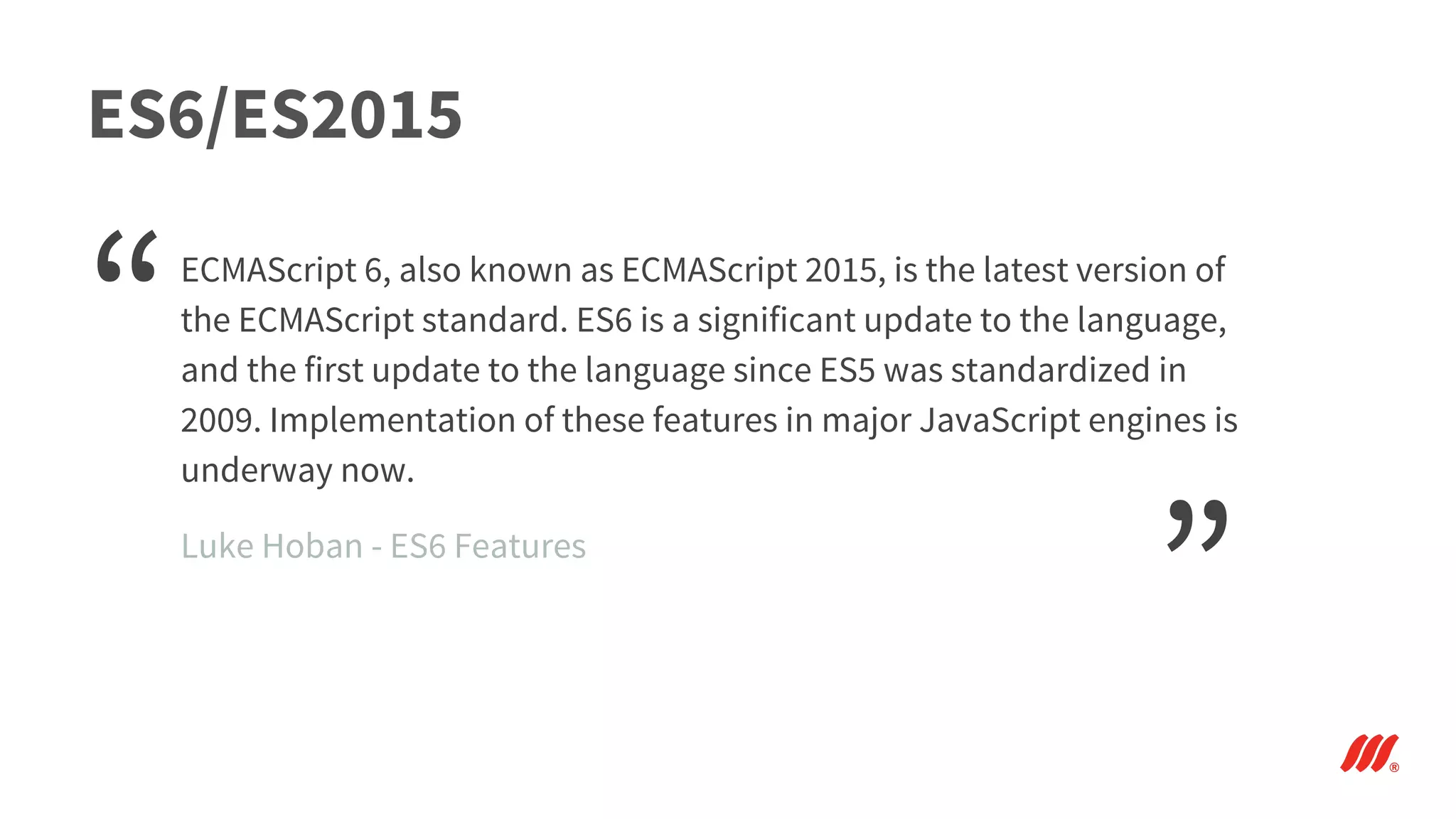 ES6, or ECMAScript 2015, is a major update to the JavaScript language, introducing new syntax and features such as constants, block scoping, classes, modules, and promises. These enhancements improve code readability, reduce boilerplate, and provide more control over variable scope and asynchronous operations. Modern browsers are beginning to implement these features, and tools like transpilers facilitate the use of ES6 code in environments that support only earlier versions.