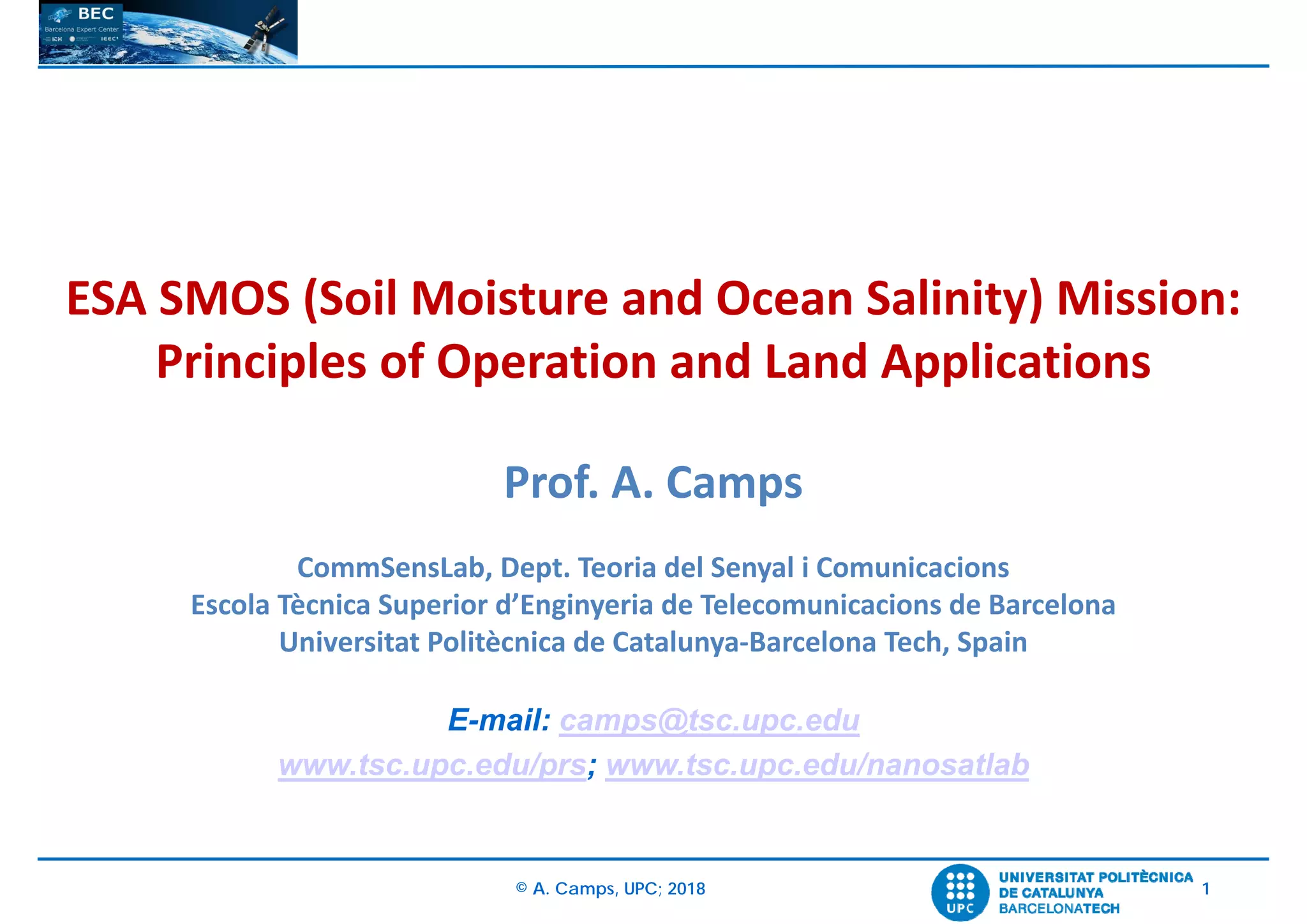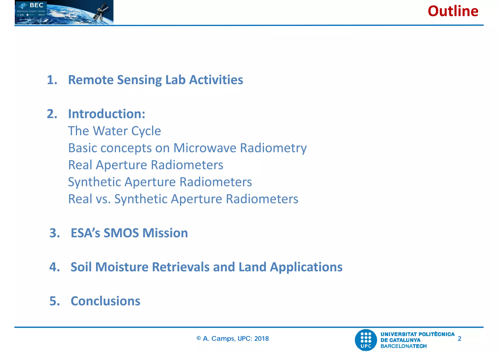 The document presents an overview of the Soil Moisture and Ocean Salinity (SMOS) mission by ESA, detailing its principles of operation and applications for soil moisture retrieval and salinity mapping. It covers relevant concepts in microwave radiometry, introduces different types of radiometers, and explains the mission's goals, including the collection of global soil moisture and ocean salinity data. Additionally, the document discusses technical aspects such as data processing levels, image reconstruction challenges, and the role of the mission in climate prediction and agriculture.