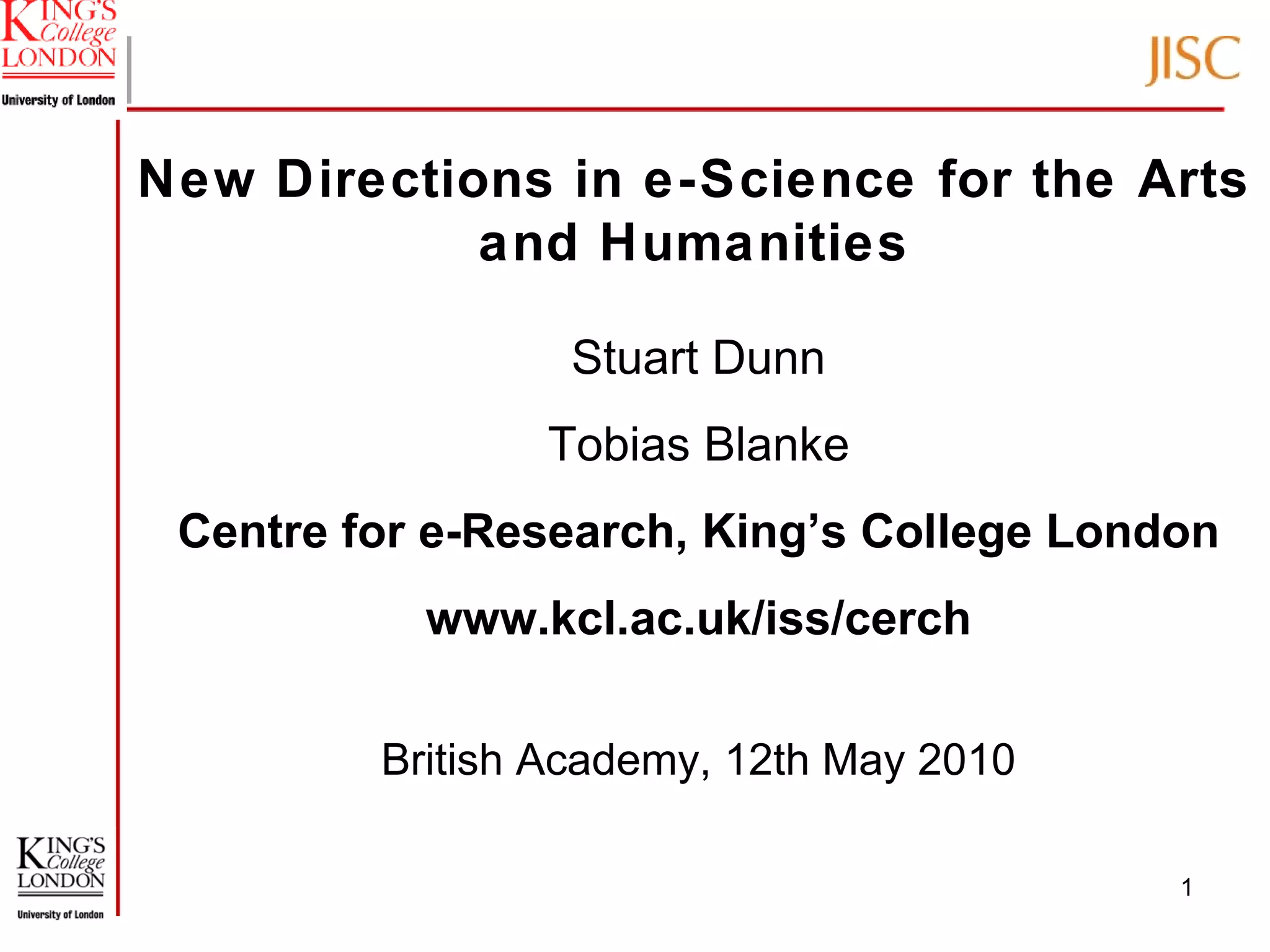 This document discusses new directions for e-science in the arts and humanities. Specifically, it discusses using networks to connect resources like virtual libraries and museums. It also addresses challenges like dealing with large datasets from simulations and linking heterogeneous resources. Finally, it provides examples of past e-science projects in areas like dance documentation, image analysis, and musicology that have helped map e-science approaches to digital humanities research.