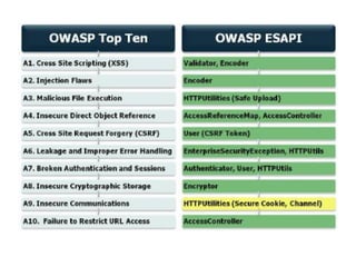 This document discusses the OWASP ESAPI project, a security API that aims to simplify application security for developers. It provides an overview of ESAPI, including that it contains over 120 security methods and interfaces and was first released in 2010. The document also notes that developers should customize ESAPI to match their own organization and that canonicalization and encoding features are mature, while data validation could be improved.