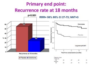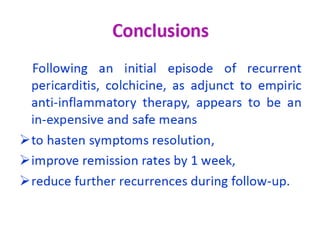 5) Colchicine for recurrent pericarditis and prolonging dual antiplatelet treatment after stenting.