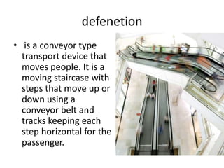 Escalators are moving staircases that transport people between floors using conveyor belts and tracks to keep steps horizontal. Jesse Reno built the first escalator in 1896 for an amusement park, while Charles Seeberger later redesigned and named the modern escalator. Escalators play a key role in transporting large numbers of people in places like shopping centers and transportation hubs. Their design considers physical requirements, traffic patterns, safety, aesthetics, and more. Escalators have components like steps, handrails, tracks, and platforms to smoothly move people up and down.