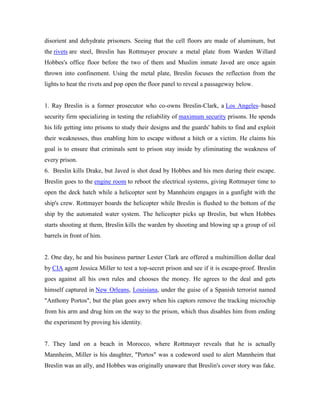 3. Breslin, Rottmayer, and Javed stage a riot to escape to the deck. Javed is killed but Breslin and Rottmayer make it to a waiting helicopter arranged by Rottmayer, who was working with Breslin the