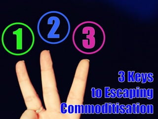 The document discusses strategies for differentiating products and services in a competitive marketplace, emphasizing the importance of innovation and creative thinking. It highlights three levels of perceived value and the need for companies to escape the 'race to the bottom' by focusing on unique offerings that exceed customer expectations. Additionally, it stresses the significance of understanding one's competitive set and adopting a mindset that fosters both passion and practicality in achieving success.