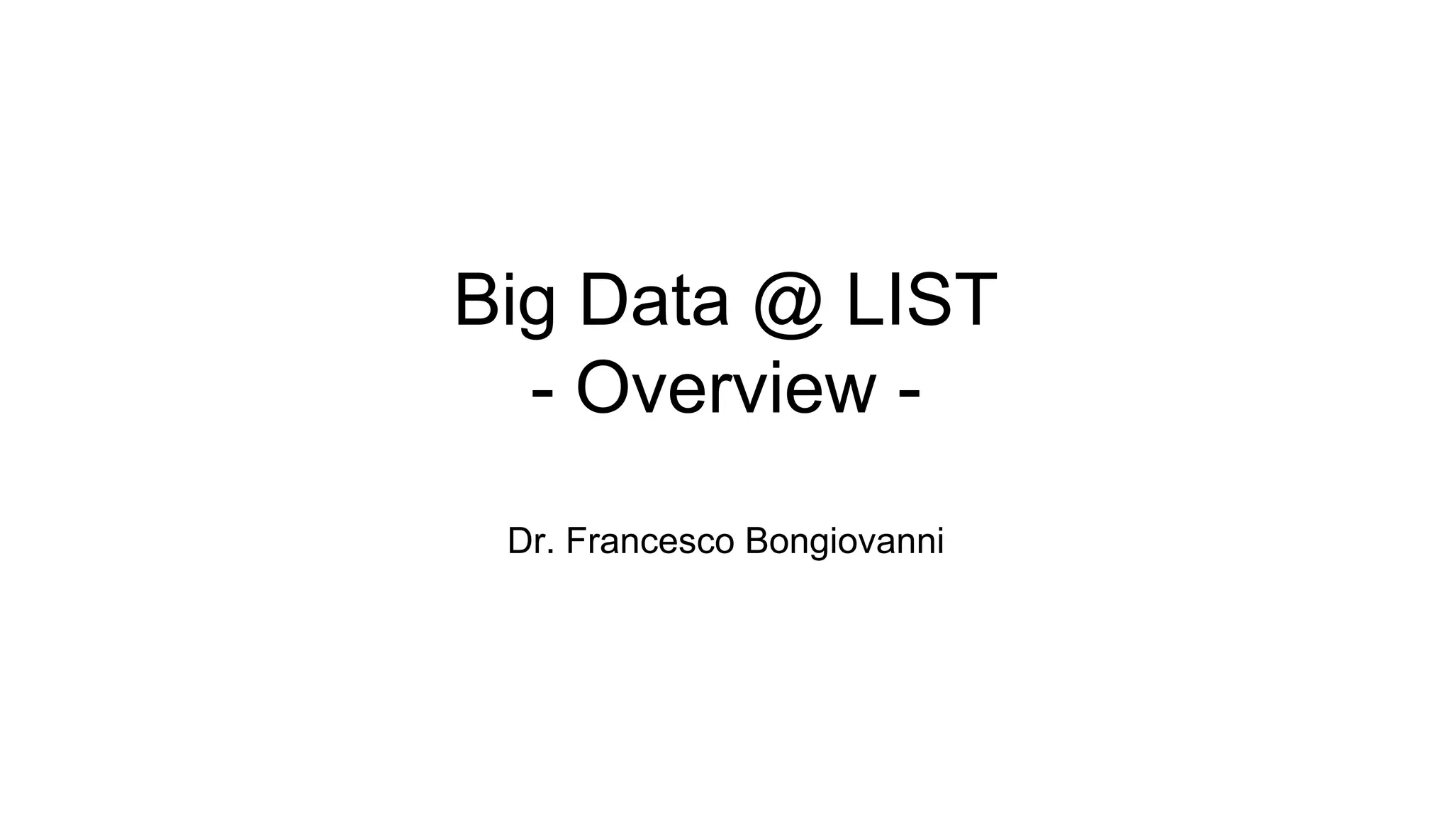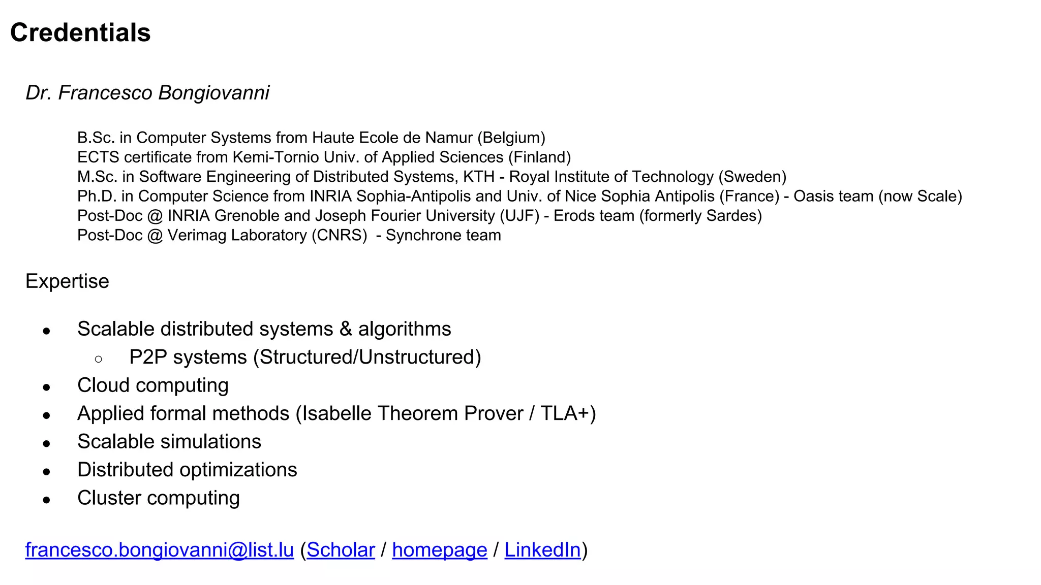 Dr. Francesco Bongiovanni has expertise in scalable distributed systems and algorithms, cloud computing, applied formal methods, and distributed optimizations. He has a B.Sc. in Computer Systems, M.Sc. in Software Engineering of Distributed Systems, and Ph.D. in Computer Science. He has worked at INRIA and Verimag Laboratory. This presentation provides an overview of big data frameworks and tools including HDFS, Mesos, Spark, Spark Streaming, Spark SQL, GraphX, MLLib, Chapel, ZooKeeper, and SparkR that can be run on the eScience cluster for processing large datasets in a scalable, fault-tolerant manner. Examples demonstrate performing operations like averaging 1 billion elements