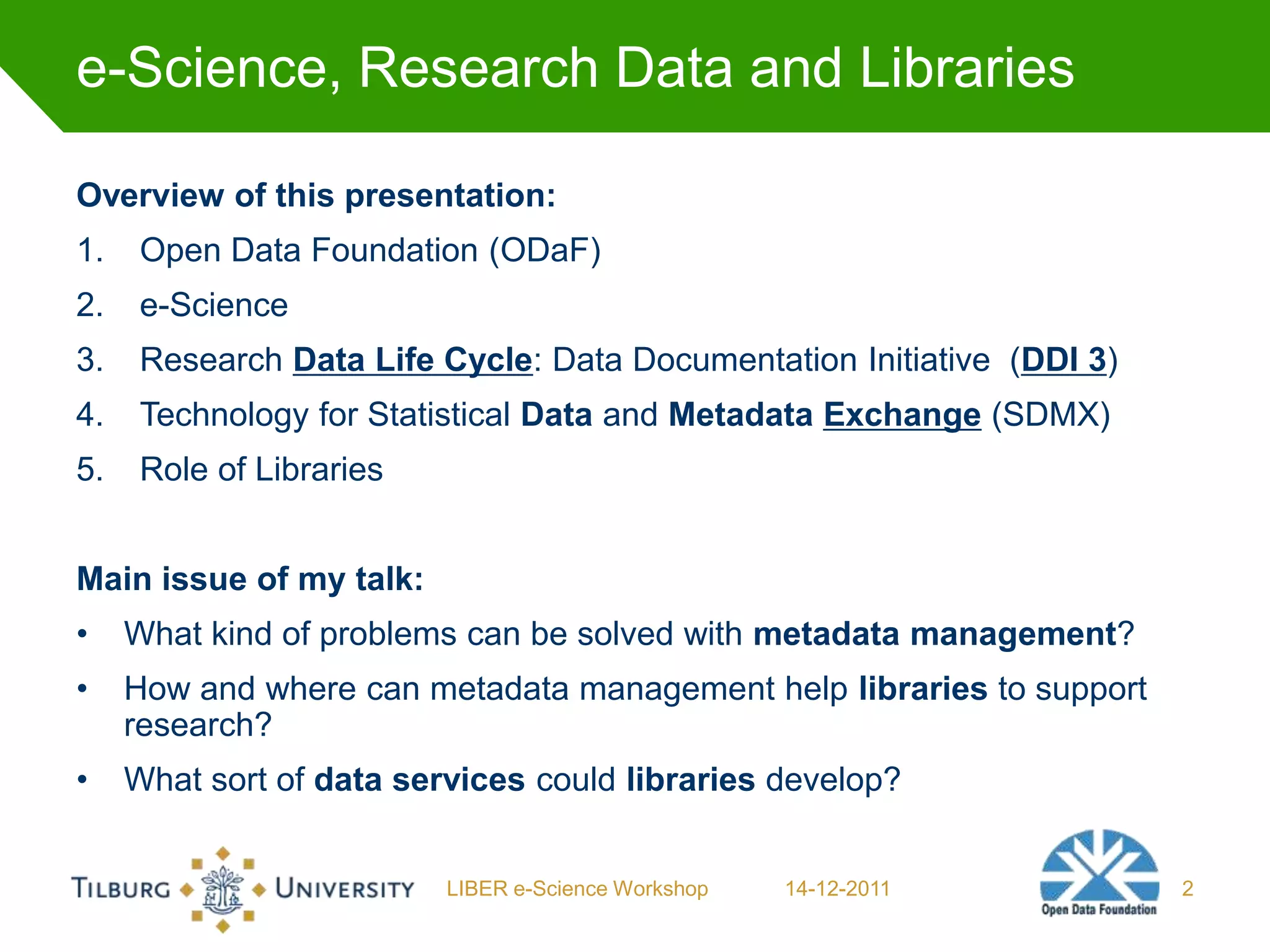 This document summarizes Rob Grim's presentation on e-Science, research data, and the role of libraries. It discusses the Open Data Foundation's work in promoting metadata standards like DDI and SDMX. It also outlines the research data lifecycle and how metadata management can help libraries support research through services like data registration, archiving, discovery and access. Finally, it provides examples of how Tilburg University library supports research data through services aligned with data availability, discovery, access and delivery.