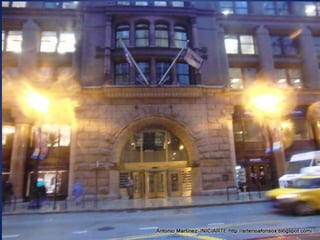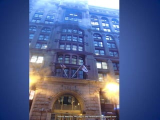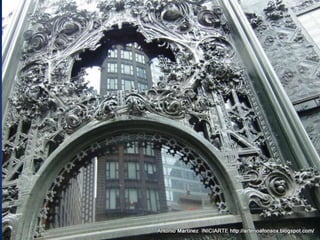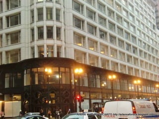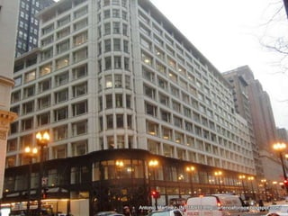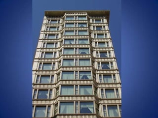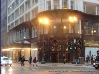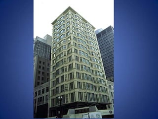This document provides examples of notable buildings from the Chicago School of Architecture, including the Carson, Pirie & Scott Building designed by Louis Sullivan in 1899, the Rockery Building designed by Burnham & Root in 1886, the Reliance Building designed by Burnham in 1890, and the Monadnock Building designed by Burnham & Root in 1891. These buildings exemplify the Chicago School style that emphasized steel-framed structures with large windows and decorative masonry.