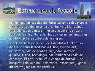 Estructura de l’escolaCreiem que les escoles del futur seran de dos pisos o més, els pisos de l’escola seran baixets i la teulada serà plana. Les classes tindran una paret de fusta corredera que a l’hora també es mouran per unes vies que hi haurà als costats de la classe. Les classes: de primària i de l’institut a la planta de dalt. I les aules: d’educació física, música, art, laboratori, sala de profes, menjador, material, química, física, tecnologia, bar, biblioteca i sala de conserge. El pati, hi haurà 2 camps de futbol, 2 de basquet, 1 de voleibol, 1 de tenis i espais per jugar a diferents jocs (saltar corda...)