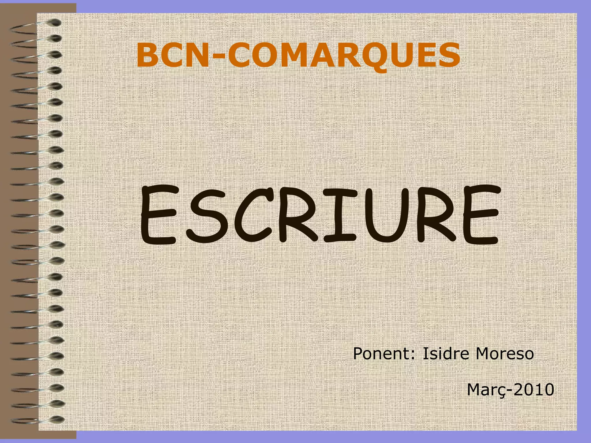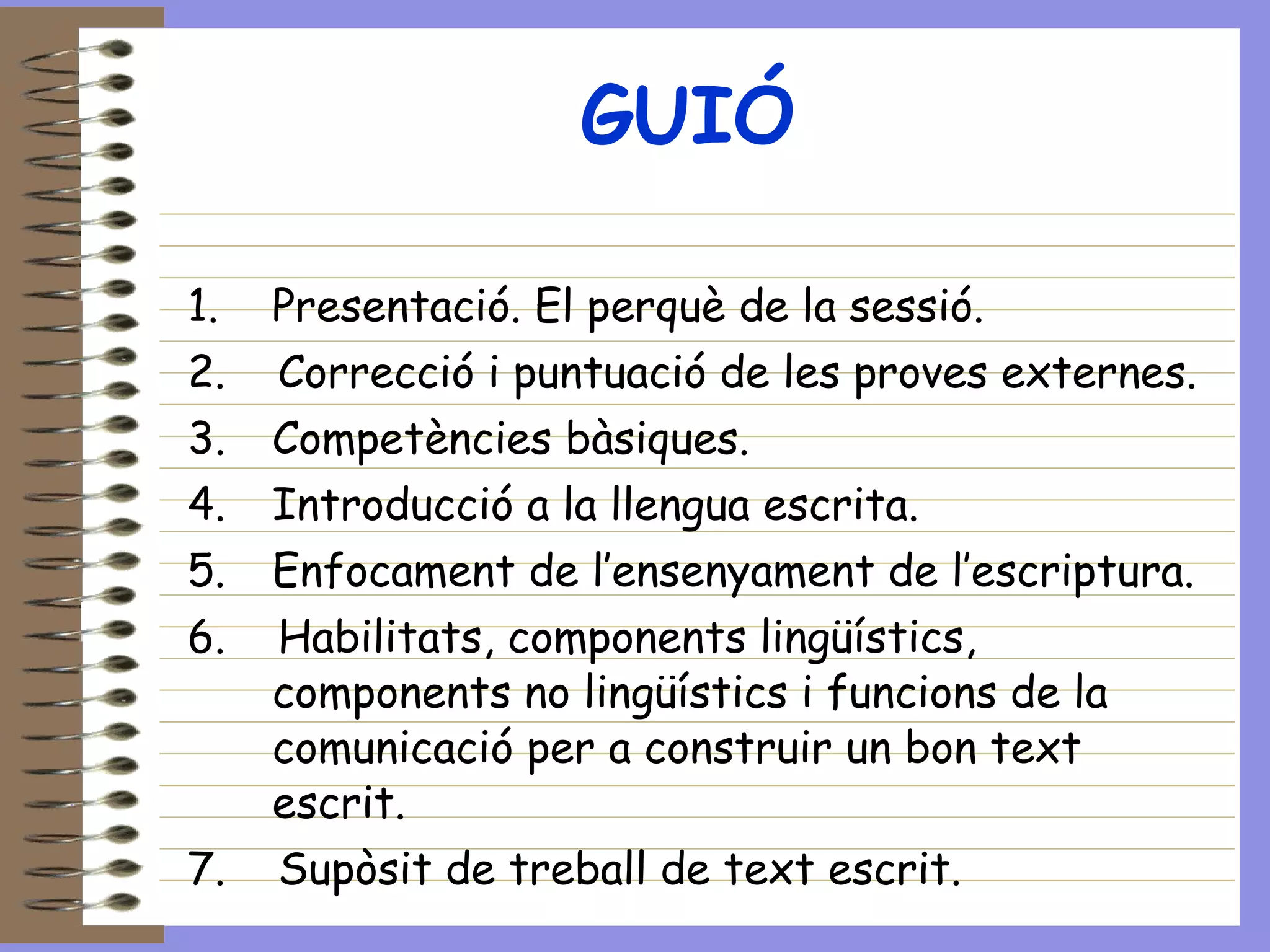 GUIÓ Presentació. Elperquè de la sessió. 2. Correcció i puntuació de les proves externes. Competències bàsiques. Introducció a la llengua escrita. 5. Enfocament de l’ensenyament de l’escriptura. 6. Habilitats, components lingüístics, components no lingüístics i funcions de la comunicació per a construir un bon text escrit. 7. Supòsit de treball de text escrit.
