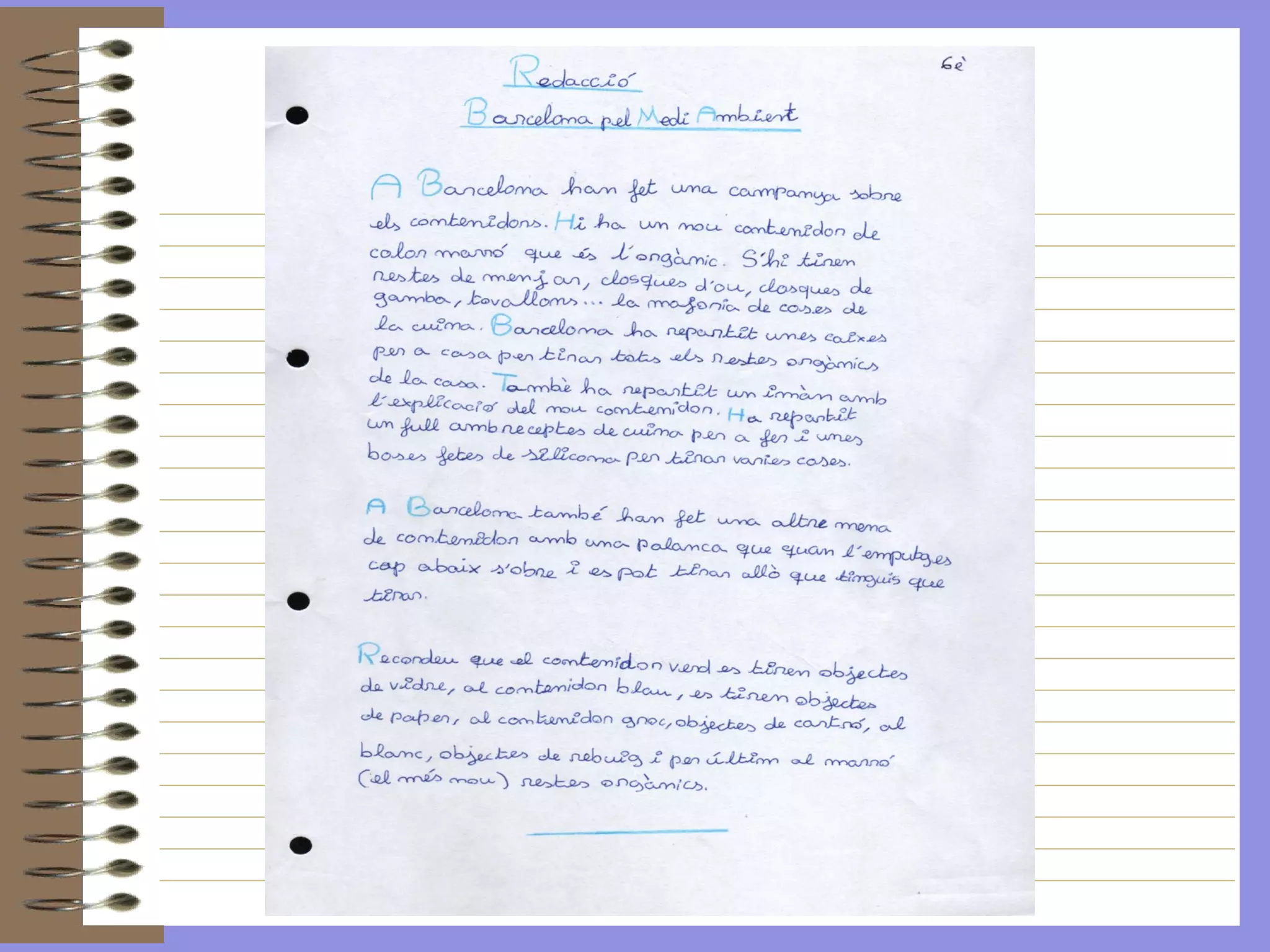 TEXT PER A ÉSSER LLEGIT Títol : ELS NOUS CONTENIDORS DE BARCELONA Introducció Justificació Des del 2 de novembre d'enguany s’estan instal·lant als carrers de Barcelona uns nous contenidors de recollida d’escombraries, els quals s'han dissenyat per garantir l'accés de tota la població. El nou disseny innovador es coneixerà amb el nom de Model Barcelona . Enumeració o índex En especial s'ha tingut en compte l'alçada, les opcions d’obertura, els colors i les marques tàctils per distingir els diferents contenidors. També s’ha pensat en la distribució dels nous contenidors i en la seva adaptació als diferents carrers de la ciutat. I finalment, per fer més fàcil la recollida de deixalles se’n posaran més. Desenvolupament Alçada Un dels fets més destacats dels nous contenidors és que situen l'alçada de l'obertura a 122 centímetres del terra, cosa que facilita que hi puguin tirar les escombraries les persones amb cadira de rodes. Aquesta alçada fa els contenidors més accessibles també per a la gent gran, per a les persones baixes i per als nens. Opcions d’obertura Pel que fa al sistema d'obertura, els contenidors de les deixalles orgàniques i les de rebuig (el marró i el gris) disposen d'una palanca manual a la banda dreta, la qual s’acciona fàcilment i sense gaire força; i també d'un pedal que s'adapta a l'alçada de la vorera. El tancament de la tapa es fa a poc a poc, amb temps suficient per llençar les bosses d’escombraries sense haver de preocupar-se per una caiguda brusca.