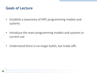 This document introduces programming models for high-performance computing (HPC). It establishes a taxonomy to classify programming models and systems. The main goals are to introduce the current prominent programming models, including message-passing, shared memory, and bulk synchronous models. The document also discusses that there is no single best solution and that there are trade-offs between different approaches. Implementation stacks and hardware architectures are reviewed to provide context on how programming models map to low-level execution.