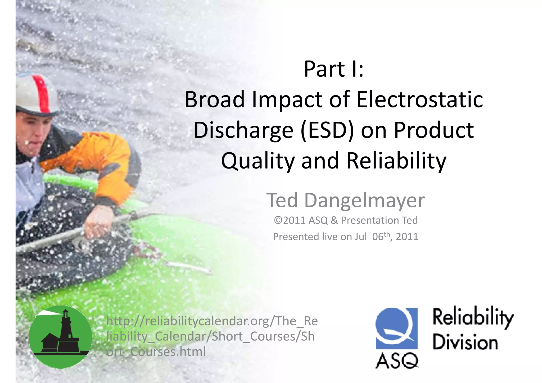 The document discusses the significant impact of electrostatic discharge (ESD) on product quality and reliability, identifying it as a leading cause of integrated circuit failures. It presents trends in ESD sensitivity, reviews different discharge models, and outlines the necessity for effective ESD countermeasures across various device types and assembly processes. Key findings include the importance of addressing failures beyond the device level, including charged board events and system-level testing, as part of ESD management strategies.
