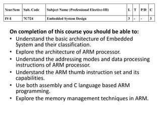 This document provides an overview of the course "Embedded System Design". The course aims to help students understand embedded system architecture, ARM processors, ARM programming models, and memory management techniques. It covers topics like embedded system classifications, ARM instruction sets, ARM assembly and C programming, cache architecture, and page tables. The document includes the course syllabus, mapping of course outcomes to program outcomes, and introductory content on embedded systems, microcontrollers, RISC vs CISC architectures, and Von Neumann/Harvard architectures.