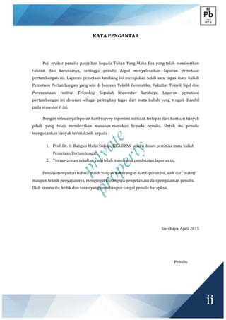 Laporan ini merupakan tugas pemetaan pertambangan timbal oleh Anindya Nadhira Rafitricia di Institut Teknologi Sepuluh Nopember, Surabaya. Dalam laporan ini dibahas karakteristik timbal, potensi galena di Lombok Tengah, serta metode pemetaan dan survey topografi. Tujuan laporan ini adalah untuk mengenal sifat logam timbal dan mengetahui persebarannya di Indonesia.