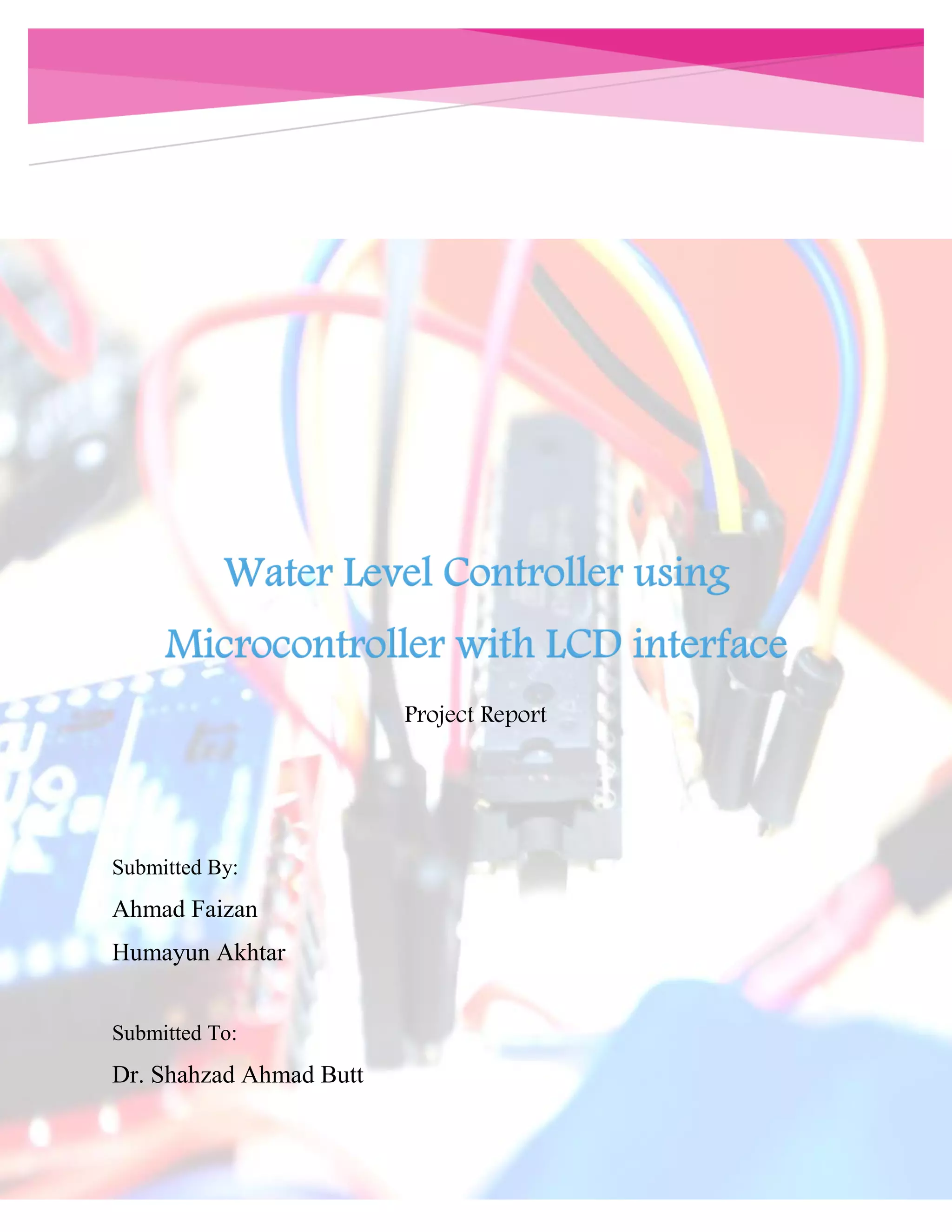 This document describes a project to monitor and control water level in a tank using an ultrasonic sensor and Arduino with a real-time operating system. It uses an ultrasonic sensor to constantly monitor water level and a pump to fill the tank when needed. The system is modeled as 4 tasks - one to read sensor data, one to control the pump, one to update an LCD display, and an idle task. The tasks communicate using semaphores to synchronize access to shared resources.
