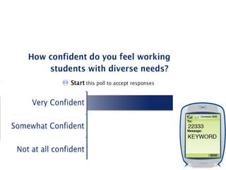 The document discusses strategies for teaching students with special needs in inclusive classrooms, including an overview of the categories of disabilities teachers may encounter, legislation affecting special education, and instructional strategies like Universal Design for Learning to reach all learners as well as behavior management techniques.