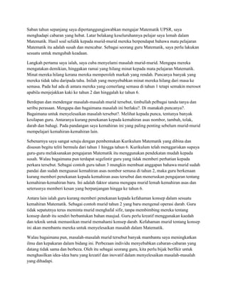 Guru Matematik UPSR ini menghadapi cabaran mengajar murid-murid yang lemah dalam mata pelajaran tersebut. Beliau menyelidik masalah ini dan mendapati kebanyakan murid tidak memahami asas-asas nombor kerana guru sebelumnya tidak memberi tumpuan yang cukup. Guru ini berusaha memperbaiki keadaan dengan menekankan pemahaman konsep asas secara kreatif. Beliau juga ingin berkongsi pengalaman dan strateg