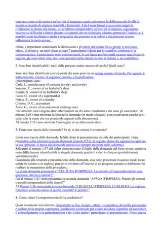 Il documento analizza un focus group tenutosi nel 2010, finalizzato a comprendere le dinamiche imprenditoriali femminili all'interno di un progetto europeo di lifelong learning. Vengono criticati la mancanza di interazione tra i partecipanti e l'approccio della conduttrice, che ha limitato il coinvolgimento e la profondità della discussione. Infine, sono evidenziati i problemi che l'analisi dei dati potrebbe presentare, inclusa la difficoltà di categorizzare le informazioni emerse e la mancanza di identificazione dei partecipanti.