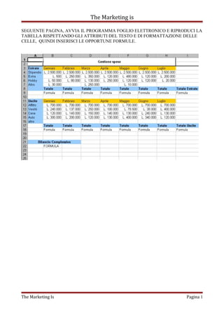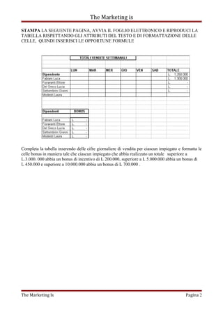 Il documento fornisce istruzioni dettagliate su come creare e gestire diverse tabelle in un foglio elettronico, inclusi calcoli di vendita, rimborso chilometrico e tabelle di rendimento. Viene richiesta l'applicazione di formule, la formattazione condizionale e la creazione di grafici per visualizzare i dati. Infine, si chiede di inserire formule per calcolare medie e risultati accademici degli studenti.