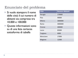 Il documento descrive un esercizio di programmazione per studenti del liceo tecnico, incentrato su come stampare il nome delle città con abitanti tra 10.000 e 100.000. Vengono presentati vari tentativi di soluzione, evidenziando errori e miglioramenti fino a raggiungere una soluzione finale corretta con un meccanismo di iterazione adeguato. La soluzione finale è considerata la migliore per la sua chiarezza e facilità di implementazione nella programmazione strutturata.
