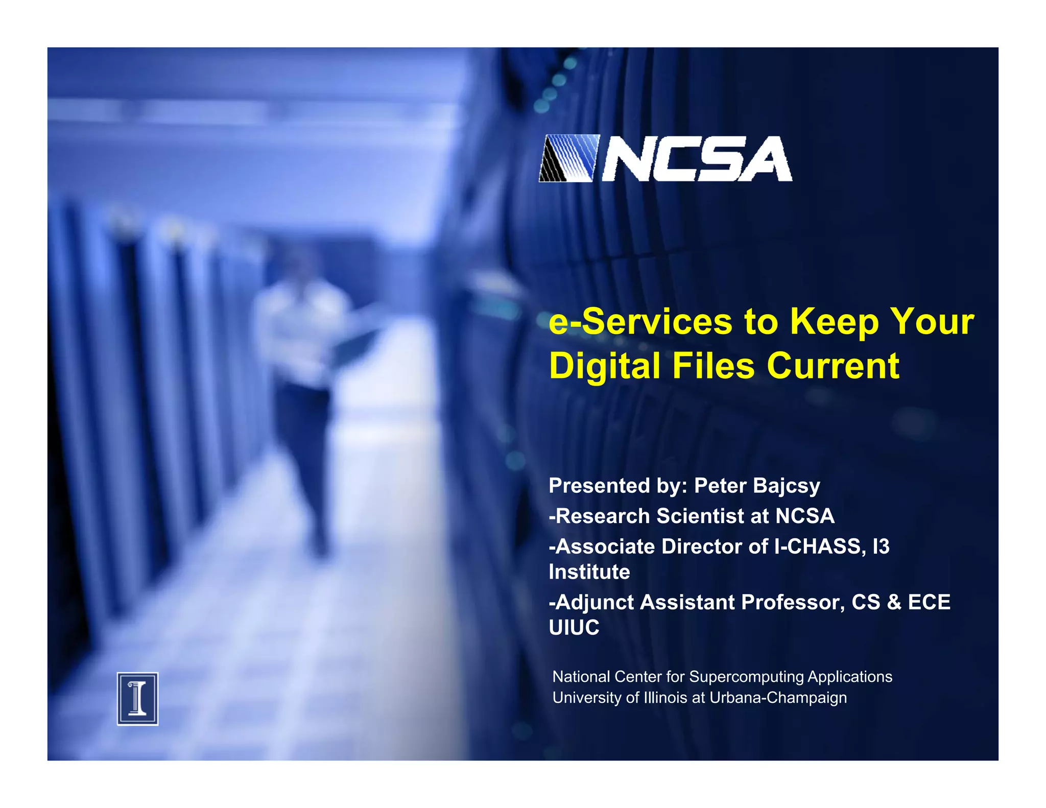 This document summarizes technologies to support file format conversions for digital preservation. It presents three services: (1) a Conversion Software Registry to find conversion software between formats, (2) a File Conversion Engine to automatically execute conversions via third-party software, and (3) File Comparison Engines to evaluate information loss from conversions. These services aim to help archivists select preservation formats and evaluate conversion quality at scale. The document outlines related challenges and how the services address issues like software extensibility and computational requirements for large-scale conversions and comparisons.