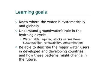 The document discusses global water resources and usage. It notes that most water is stored underground as groundwater and that groundwater plays a key role in the water cycle. It also summarizes that most global water usage is for agricultural purposes and that many regions and countries are facing water stress or shortages as usage exceeds renewable supply. Poor water management policies and practices in some areas like Yemen are exacerbating existing water challenges.