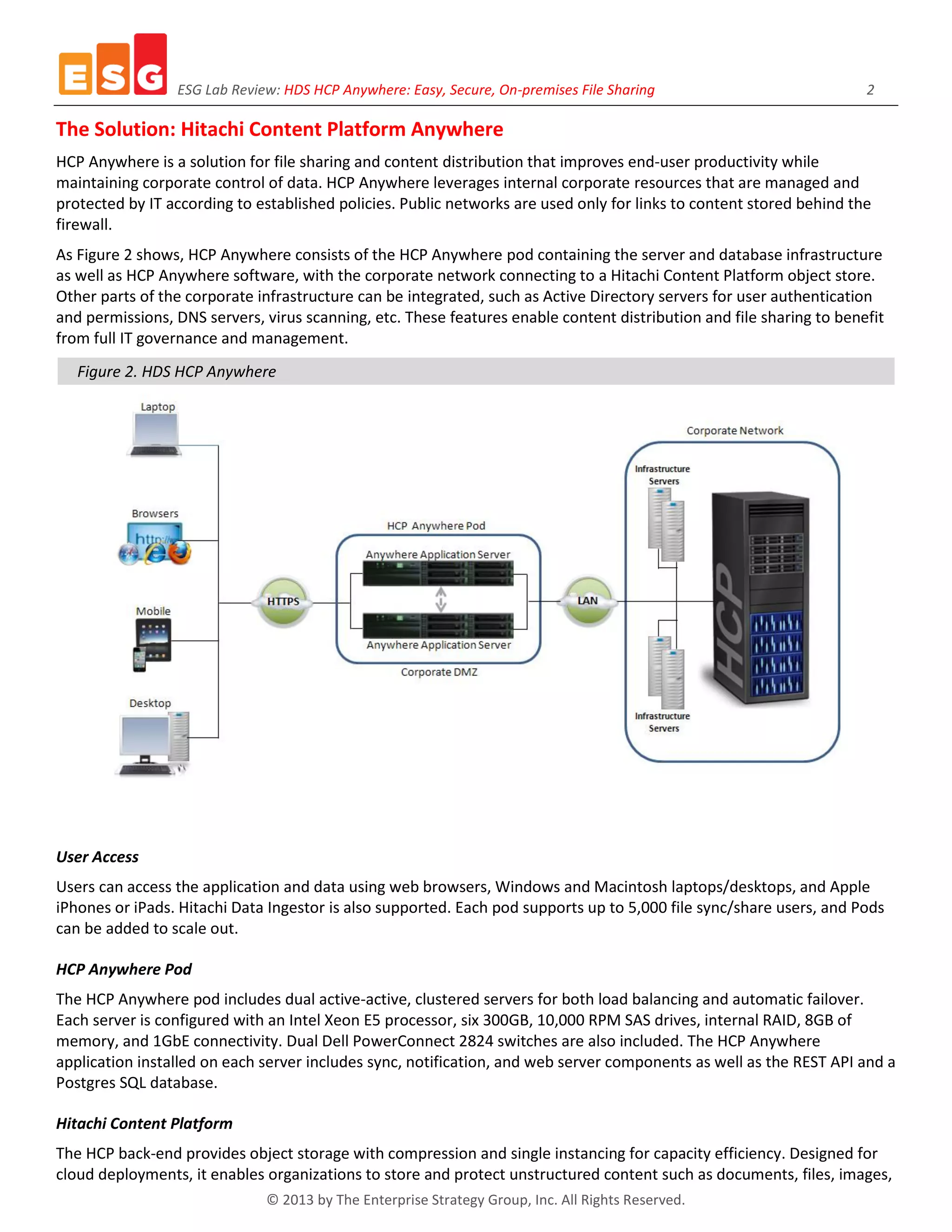 The ESG Lab reports aim to inform IT professionals about emerging data center technologies, offering insights without replacing the evaluation process for purchasing decisions. This specific report focuses on Hitachi's Content Platform Anywhere, highlighting its ease of use, security features, and corporate control while addressing common challenges associated with online file sharing and collaboration solutions. The report emphasizes the importance of secure data management and the integration of user-friendly interfaces to ensure productivity and compliance within organizations.