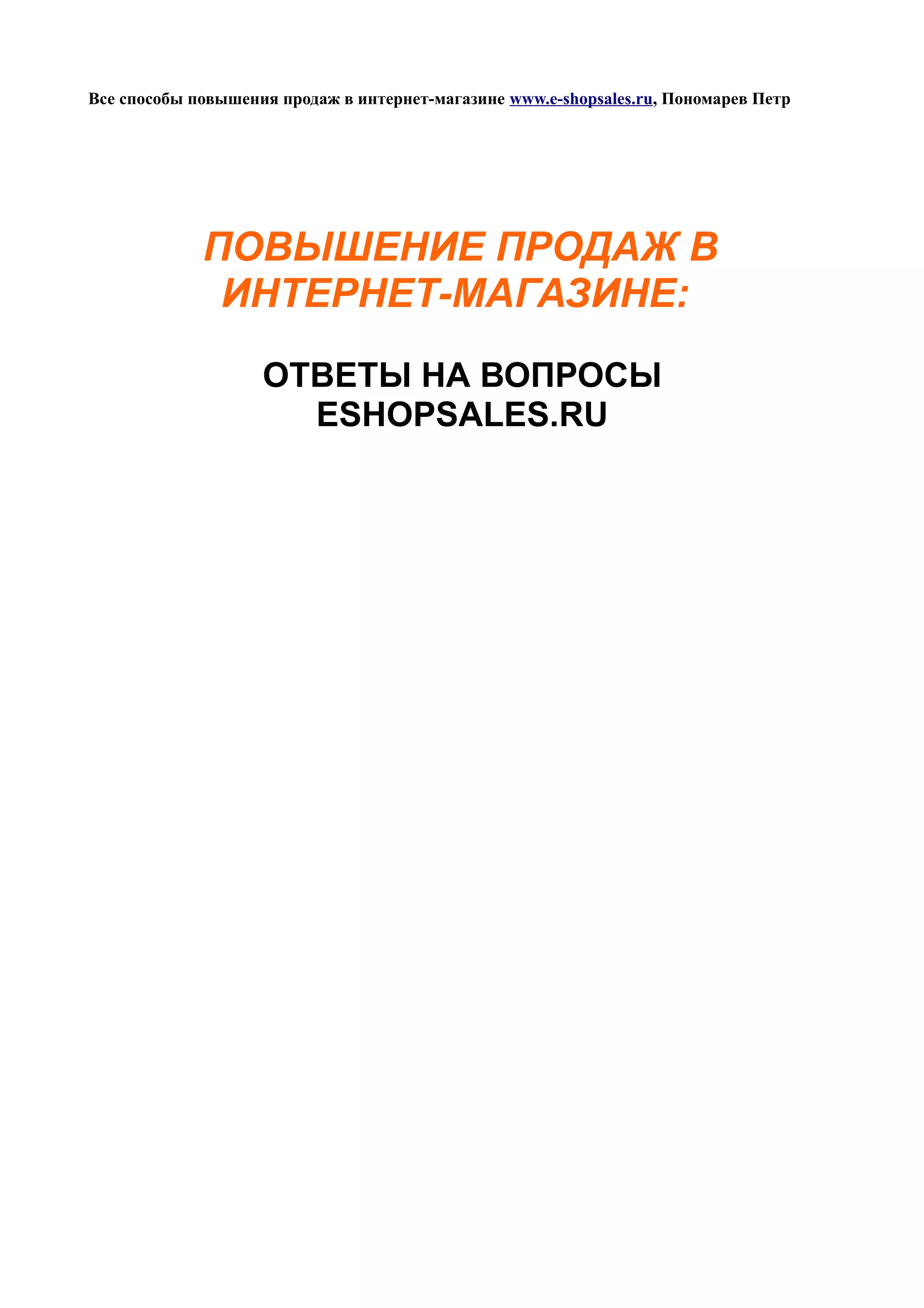 Документ рассматривает различные стратегии и методы повышения продаж в интернет-магазинах, включая важность SEO, контекстной рекламы и SMM. Также обсуждаются вопросы целевой аудитории и эффективность различных рекламных каналов, а также указывается на необходимость комплексного подхода и анализа результатов. В заключение подчеркивается значимость юзабилити и содержания страниц для улучшения конверсии.