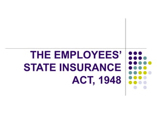 The Employees' State Insurance Act, 1948 provides sickness, maternity, disability, and medical benefits to employees of registered factories and establishments. It applies to factories/establishments with 20+ employees earning up to Rs. 10,000 per month. Employees contribute 1.75% of wages and employers contribute 4.75% to the ESI fund. Benefits include sickness, maternity, disability, dependents', medical benefits, and funeral expenses. The rates for daily sickness, disability, and dependents' benefits were increased by 20% and funeral expenses were increased to Rs. 3,000 in December 2007.