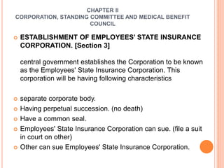 1) It establishes the Employees' State Insurance Corporation as a separate corporate body to administer the Act. The Corporation consists of representatives from central/state governments, employers, employees, and medical professionals.