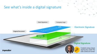 The document outlines the critical role of e-signatures in digitizing various business processes across sales, marketing, finance, and operations while ensuring compliance with relevant regulations. It discusses the importance of security, consent, and proof of identity in electronic agreements, as well as the benefits of digitization, including improved efficiency and reduced fraud. Additionally, it highlights success stories from customers who have streamlined their operations through integrated digital signing solutions.