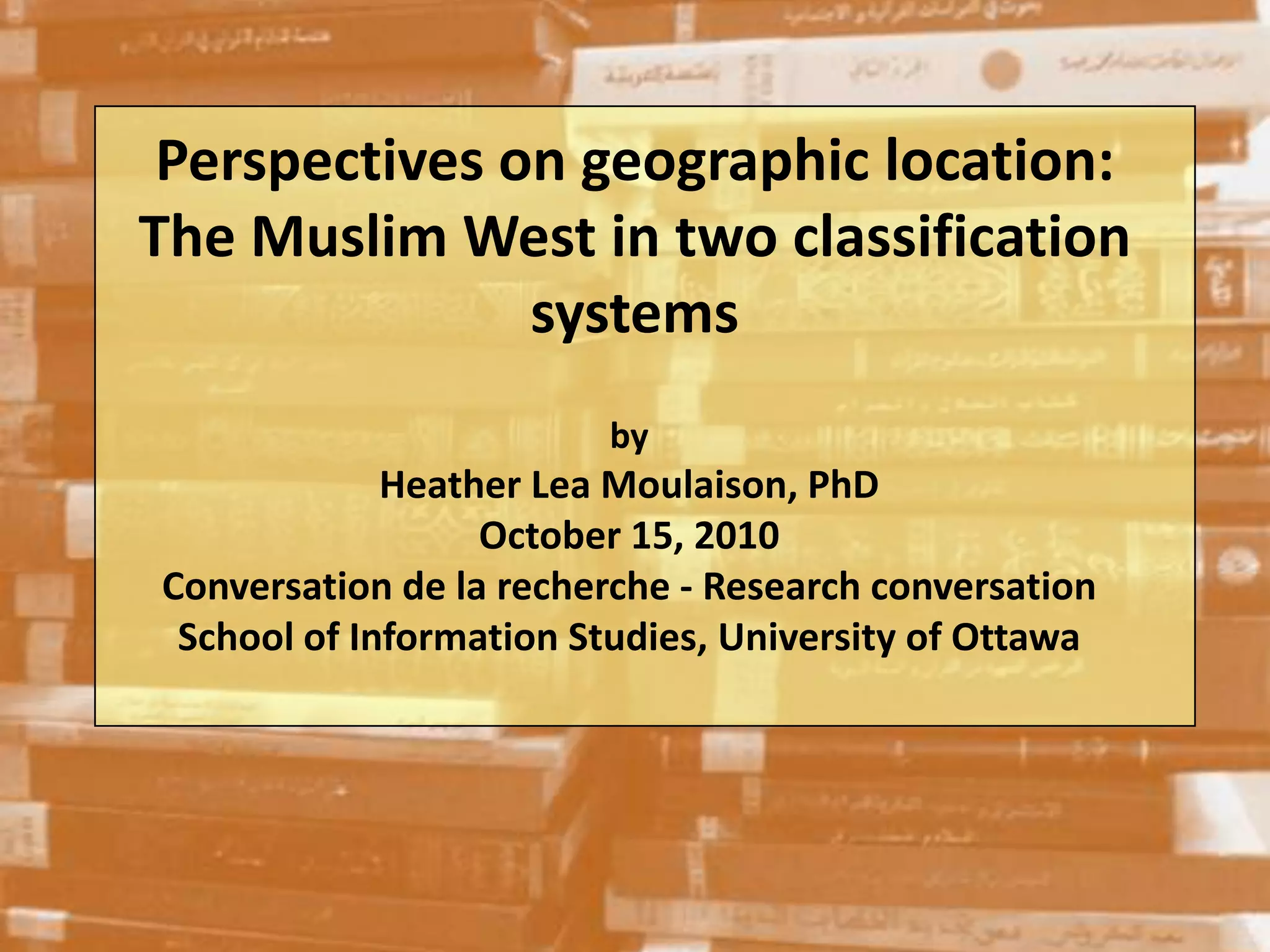 This document compares the intellectual access to geographic locations in the Muslim West provided by the Dewey Decimal Classification (DDC) and the Ibn Rushd Thesaurus (IRT). It discusses inherent biases in classification systems influenced by cultural perspectives, highlighting that while DDC is criticized for its Western bias, it still provides significant coverage of locations in Morocco and the Iberian Peninsula. The findings suggest DDC can adequately classify many locations of interest despite differences in the underlying approach to geographic classification.