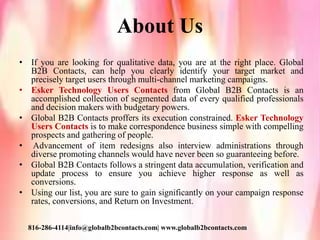 Global B2B Contacts LLC offers comprehensive mailing lists aimed at enhancing marketing campaign effectiveness by targeting key decision-makers across various industries. Their services include data acquisition, verification, and customized solutions to ensure high response rates, conversions, and return on investment. They provide detailed contact information and a free consultation to help clients bolster their business outreach.