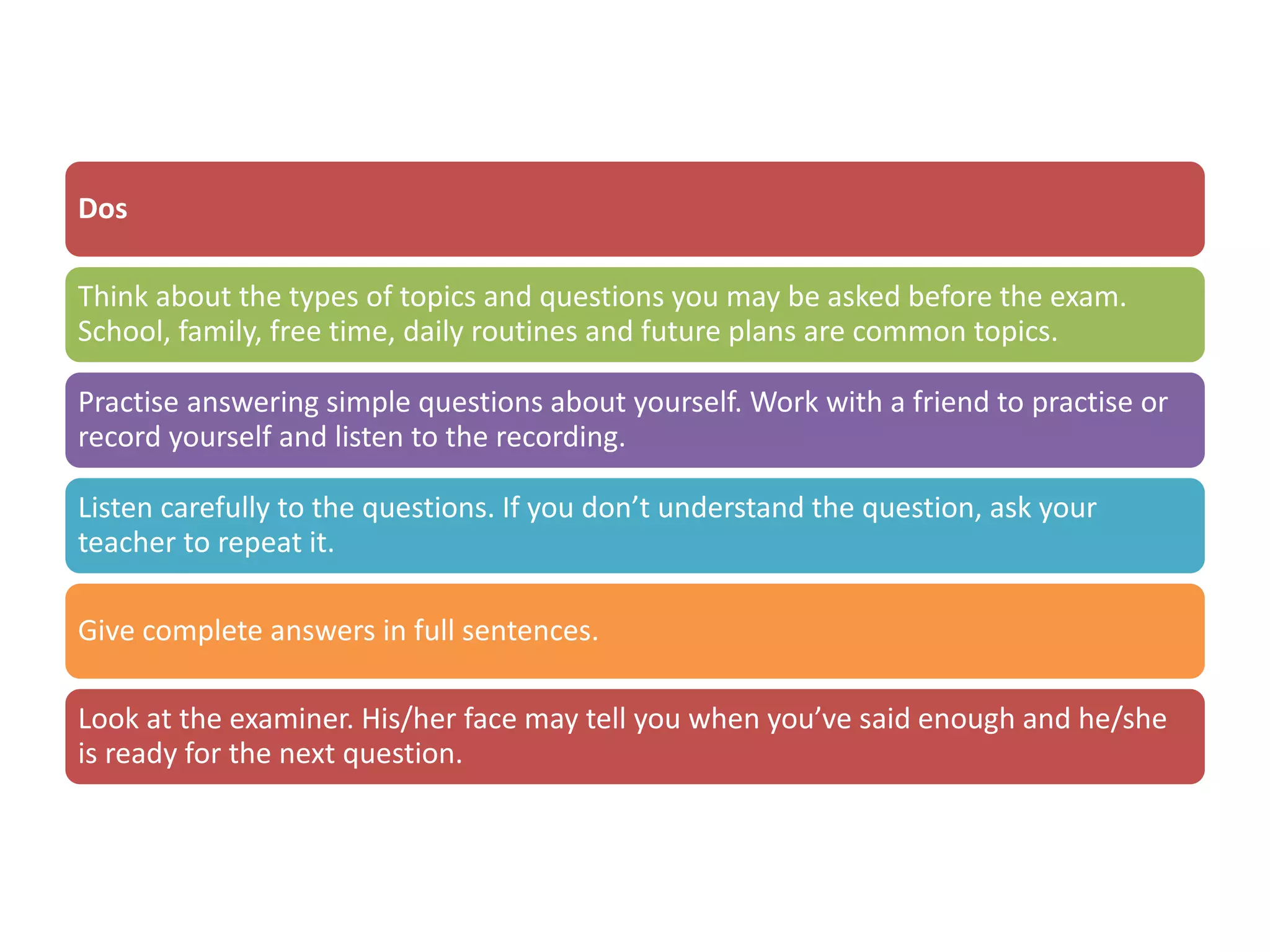 This document provides tips and examples for talking about yourself during an exam. It advises to think about common topics like school, family, hobbies and plans for the future. Some sample questions are also included that may be asked, such as name, age, where you live, family members and interests. The document recommends practicing your answers with a friend and not memorizing responses.
