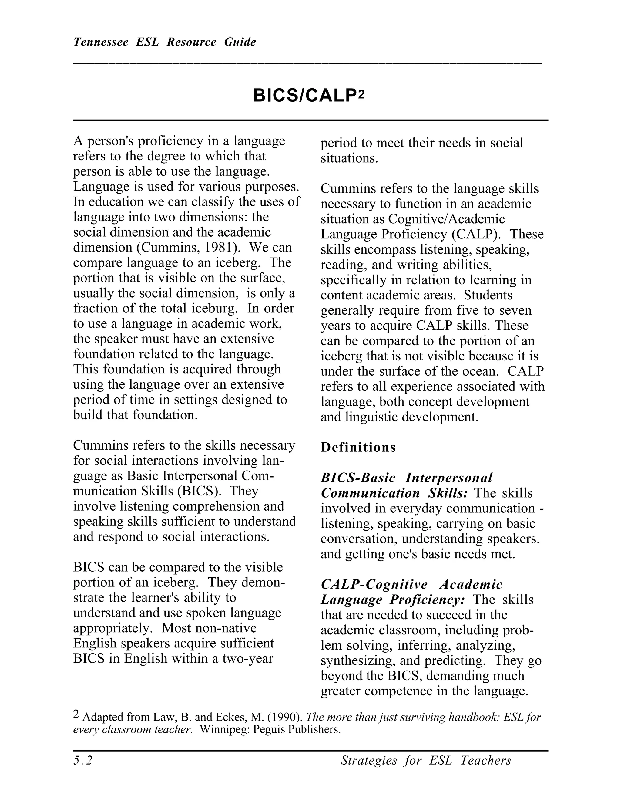 - BICS and CALP distinguish between the social language skills needed for everyday communication versus the cognitive academic skills required for academic success. Students typically acquire BICS in 2 years but need 5-7 years to develop CALP.