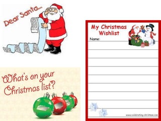Jesus's birth and the traditions of Santa Claus, decorations, food, and dress-up are discussed in the document. Christmas cards are also mentioned as part of the seasonal celebrations. The high-level topics covered in the short document relate to religious and cultural aspects associated with Christmas time.