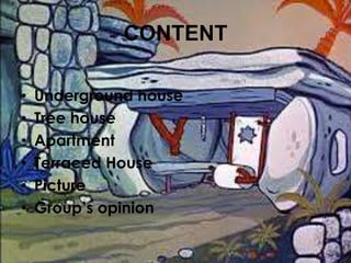 Underground houses, tree houses, apartments, and terraced houses are discussed. Underground houses provide natural insulation from the surrounding earth. Tree houses are built from wood, steel, and recycled materials. By 1900, over 75% of urban Americans lived in apartments near work. Terraced houses, known as row houses, share side walls and the end houses are larger. In conclusion, the group notes the variety of unique house types that suit different people and locations.